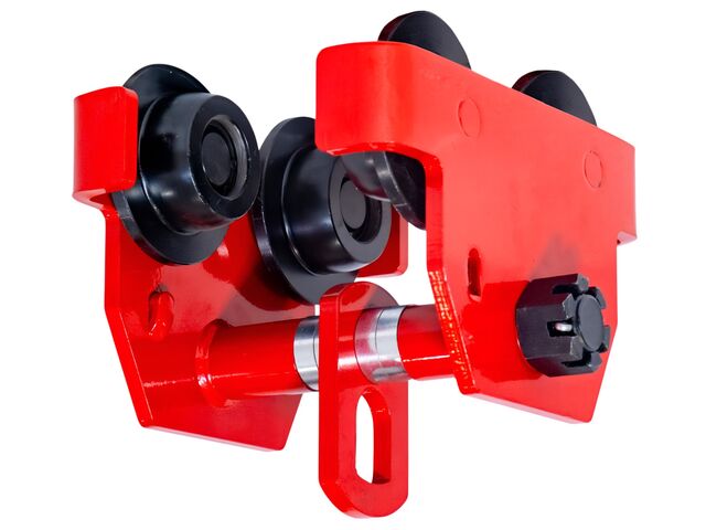 Chariot porte-palan manuel 3 tonnes, équipé de dispositifs de sécurité anti-rupture de roue, conçu pour une utilisation sur poutres métalliques et pour la suspension de palans à chaîne ou palans à câble.