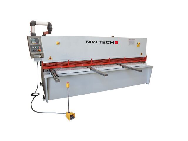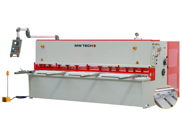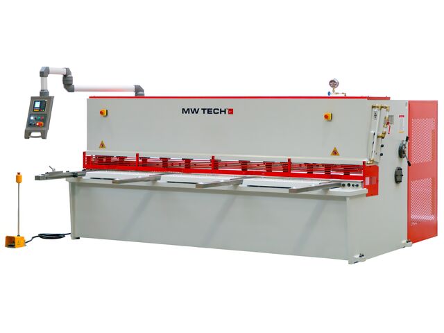 Cisaille guillotine hydraulique NC avec une largeur de travail de 3200 mm capacité de coupe de 6 mm 7,5 kW 400 V + support pneumatique pour tôles MW-Tech CGH3206P - produit présenté par TORROS Equip Garage