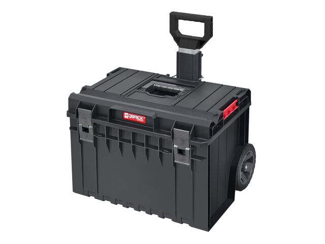 Coffre de rangement en plastique avec roues et poignée, pratique pour stocker et déplacer facilement et en toute sécurité des outils et du matériel sur le chantier.