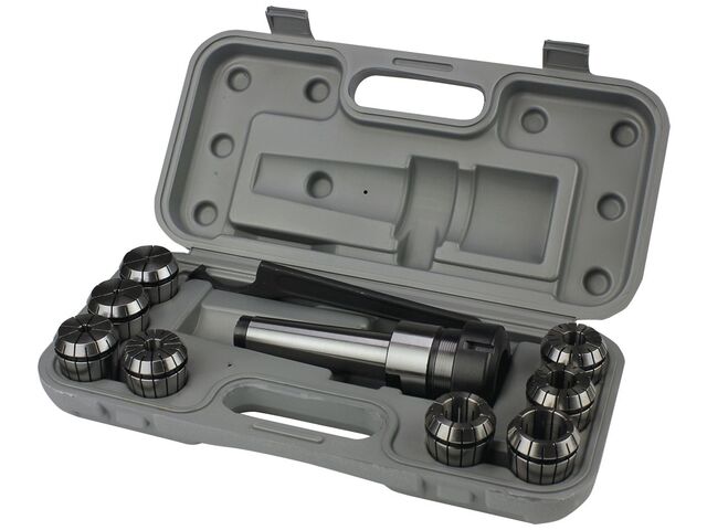 Jeu composé de 1 porte-pince, 1 clé à crochet, et plusieurs pinces de serrage ER DIN6499. Divers raccords de porte-pince possibles: CM2/M10, CM3/M12, DIN2080 ISO30, DIN2080 ISO40. Le choix est également possible entre plusieurs types de pinces de serrage ER: ER25, ER32 et ER40. Autres jeux disponibles sur demande.