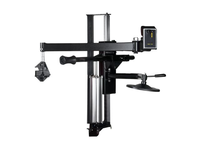 Démonte-pneu avec bras inclinable et jeu de bras auxiliaires pour pneus pour roulage à plat, pneus à profils bas et pneus à flancs rigides. Convient pour les pneus de voitures et de motos.