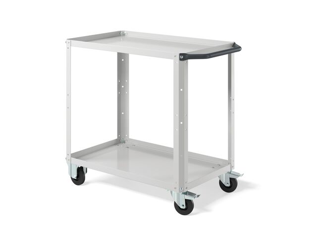 Desserte S1 modèle 2 niveaux à monter<br>Desserte équipée de :<br>> 4 roulettes : 2 roues fixes et 2 roues pivotantes à frein ø 100 mm à bandage caoutchouc standard<br>> Structure métallique avec 2 plateaux en acier. Plateaux équipés de rebords H.35 mm. <br>> Poignée de poussée. <br><br>Caractéristiques :<br>> Charge maxi chariot : 225 kg (U.R)<br>> Charge maxi par niveau : 100 kg (U.R)<br>> Finition peinte. Coloris Gris Ral