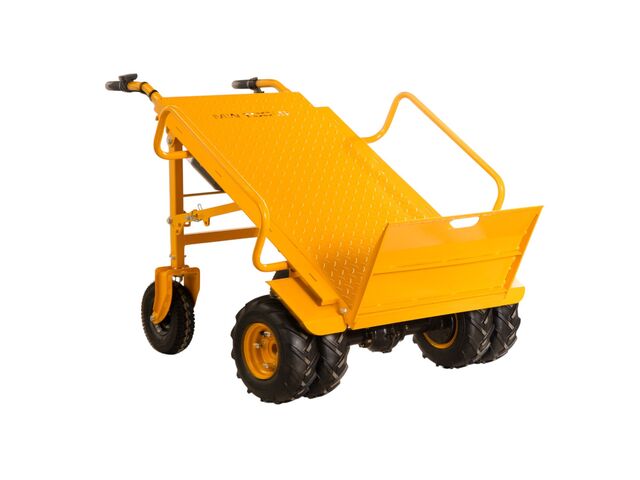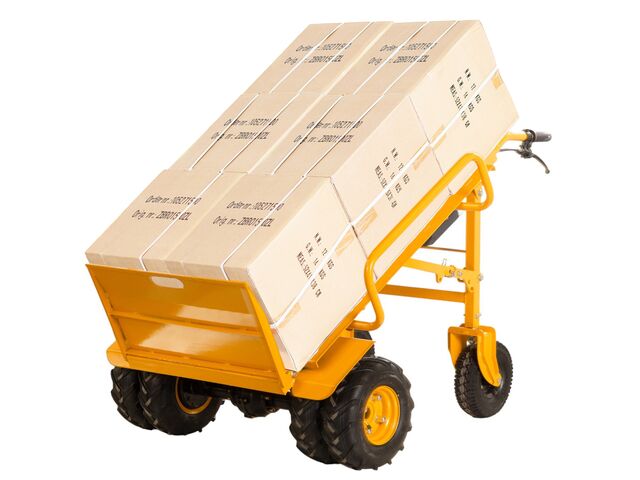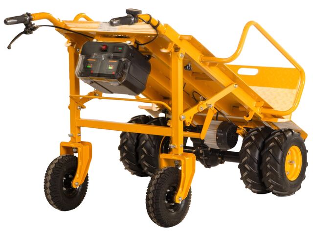 Diable électrique d'une capacité de 400 kg, d'une largeur de 940 mm conçu pour le transport de charges lourdes sur des surfaces inégales telles que l'herbe, le gravier, la plage, les allées de jardin, les chemins de terre, etc.