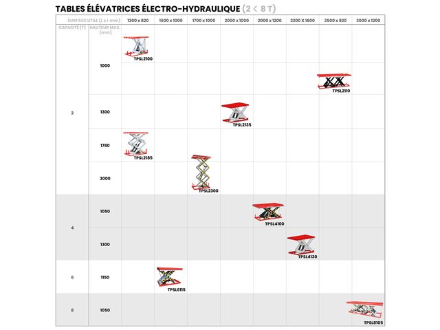 Autres tables élévatrices d'une capacité de 2000 kg et d'une hauteur de levage de 1000 mm à 1780 mm :
