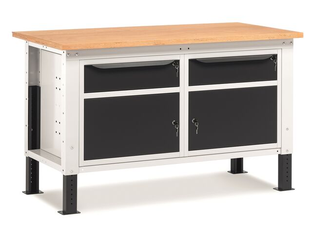 Etabli métallique Fortis n°3 avec plateau bois en multipli hêtre épaisseur 30 mm<br>Structure fabriquée en tôle d’acier de première qualité<br>Plateau supportant une charge de 1000 kg (C.U.R) <br><br>> Pieds réglables en hauteur de 732 à 1107 mm (au pas de vis de 25 mm)<br>> 2 blocs de 1 porte H.310 mm + 1 tiroir H.150 mm (dim.utile H.92 mm), extension simple à 86%<br> - Dim. hors-tout blocs : L.629*P.607*H.570 mm<br> - Charge maxi par tiroir