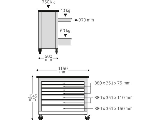 Dimensions : 1045 x 500 x 1150 mmPoids : 75 kgNombre de tiroirs : 7Dimensions des tiroirs : 880 x 350 mmMatériau de la surface de travail : Bois de bouleau (certifié FSC)Roues : Résistantes à l'huile et à l'acide (D-Roul. 125 mm)Système de sécurité : Verrouillage sélectif, dispositif anti-basculementRevêtement : Revêtement en poudre industriel robuste