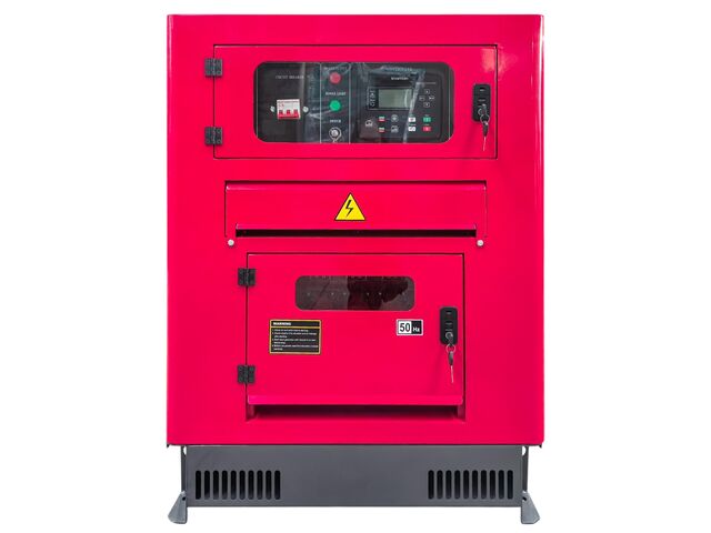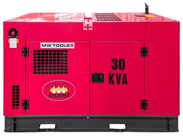 Groupe électrogène diesel 33 kVA en 3x400 V et 1x230 V, équipé d'un raccordement pour réservoir de carburant externe.