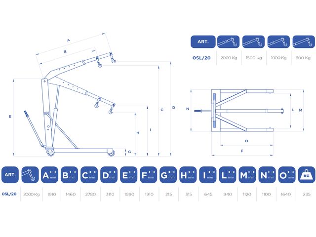 - Capacités : position 4 : 600 kg - position 3 : 1000 kg - position 2 : 1500 kg - position 1 : 2000 kg