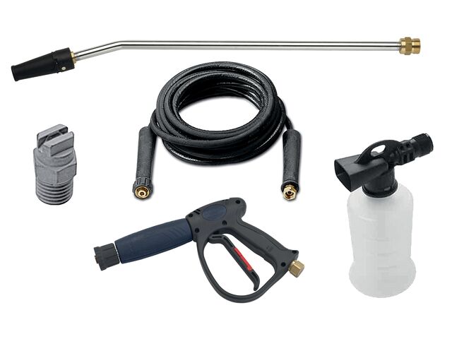 Maniable et complèt : La poignée ergonomique et les deux roues robustes en caoutchouc facilitent la manoeuvre de la machine. L'équipement standard inclus, tel qu'un pistolet de pulvérisation manuel avec contrôle de la pression et un accessoire pour mousse, vous permet de commencer à travailler immédiatement