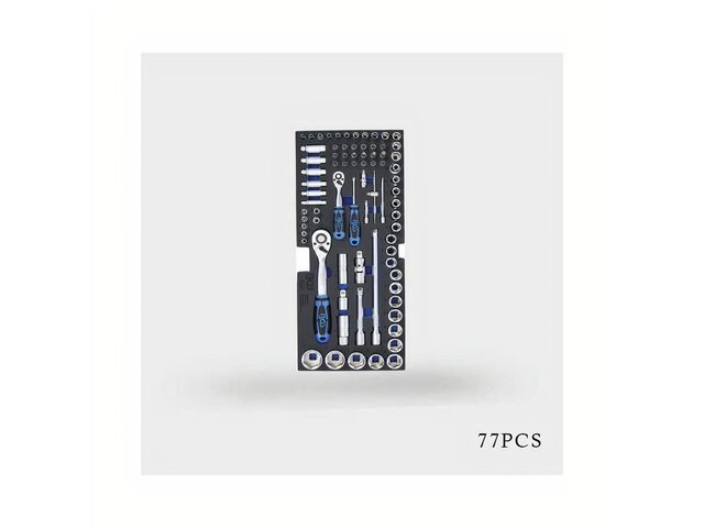 Dimensions : Largeur 500 mm, Profondeur 215 mm, Hauteur 30 mmNombre de pièces : 77Matière : Acier chrome-vanadiumTraitement de surface : Chromé, matContient : Cliquet réversible 72 crans fins avec libération rapideType de douilles : Hexagonales, profondes, Torx, embouts hexagonaux