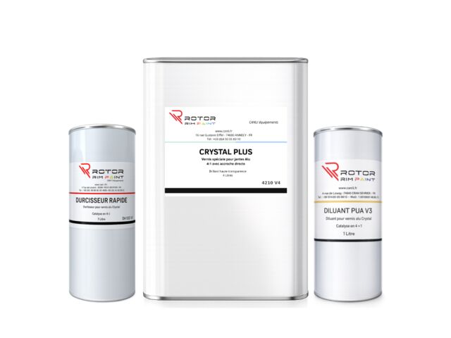 Kit vernis polyuréthane bi-composant prêt à l'emploi pour la finition des jantes aluminium usinées ou polies. Contient 1 bidon de 4L de vernis brillant, 1L de durcisseur et 1L de diluant — ratio de mélange 4:1, dilution limitée à 10-15%. Format idéal pour tester ou pour un atelier à cadence modérée.