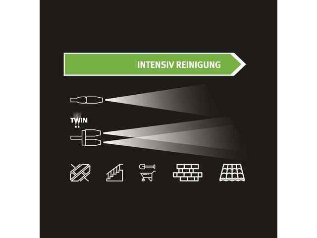 Le nettoyeur haute pression est équipé d'une buse rotative et de deux vitesses de moteur, pour diverses applications. Grâce au système de raccordement rapide CLICK-FAST sur la poignée du pistolet, vous changez de buse rapidement et facilement. Le contrôle de pompe Total Stop garantit que la pompe démarre et s'arrête instantanément lorsque vous ouvrez ou fermez le pistolet, prolongeant ainsi la durée de vie du moteur.