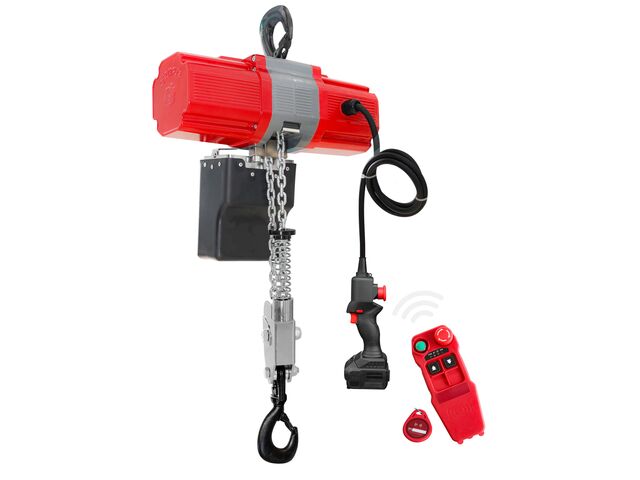 Palan à chaîne à batterie d'une capacité de 990 kg et d'une hauteur de levage de 3 m, fourni avec une batterie de 1 4Ah et un chargeur.
