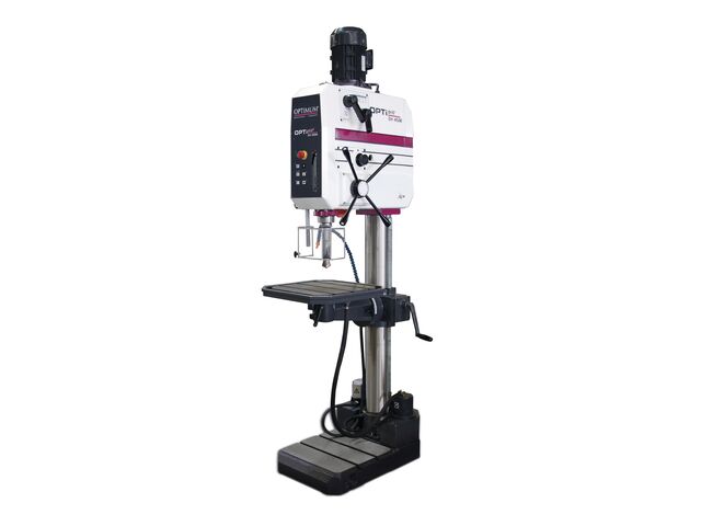 - Table de travail lourde et travaillée avec précision, avec 3 rainures en T parallèles, inclinable à +/- 90° et orientable autour de son axe, tournant également à 360° autour de la colonne, et munie d'un système de serrage puissant. Réglage en hauteur facile de la table sur une large crémaillère