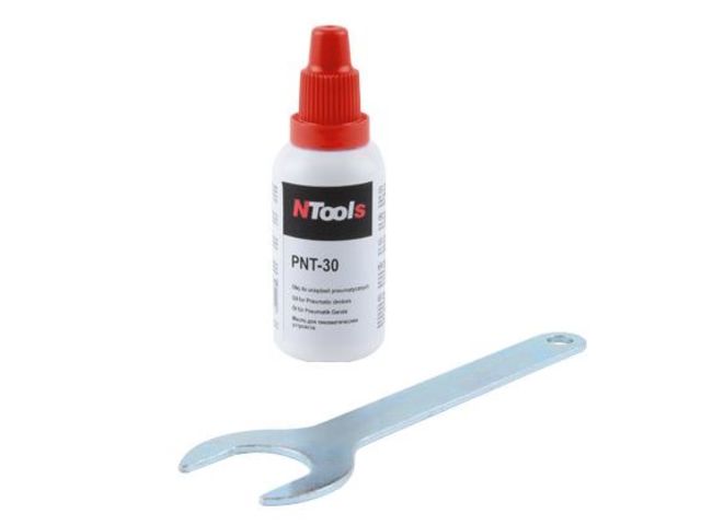 Un plateau NTools DP 15050HM, une huile pour appareils pneumatiques NTools PNT 30 et une clé plate sont proposés avec cette ponceuse pneumatique.