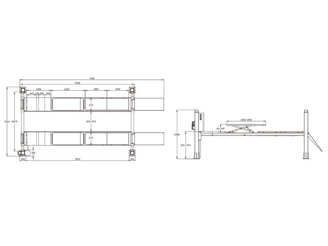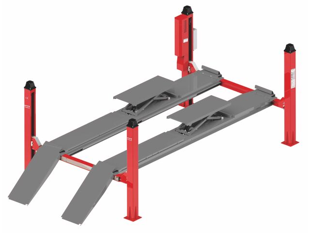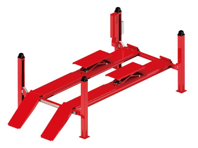 Pont élévateur hydraulique 4 colonnes d'une capacité de 5,5 tonnes, équipé d'une fonction de géométrie, d'un pont auxiliaire hydraulique de 4 tonnes, et de rampes extra longues.