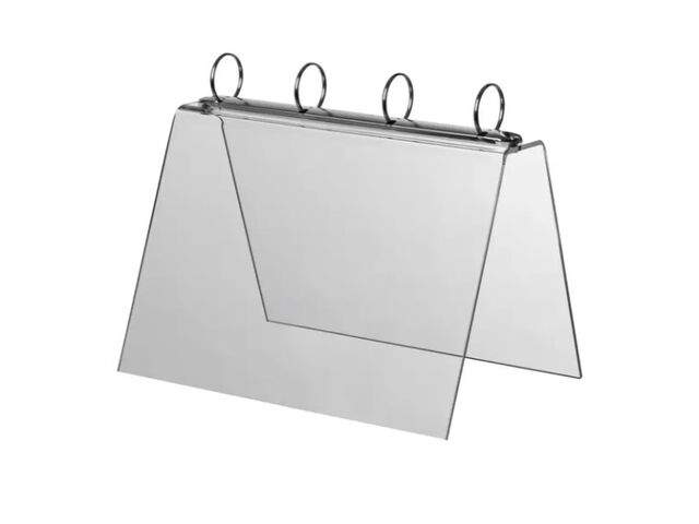Mécanisme classeur conçu pour faciliter l'accès aux informations présentées. - Fabriqué en verre acrylique transparent de 3 mm. - Compatible avec les inserts au format A4 paysage. - Largeur 300 mm - Hauteur de 220 mm - Poids : 600 g