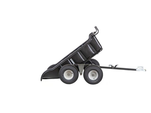 Remorque basculante de 680 kg avec une solide carrosserie en polyéthylène et un double essieu.