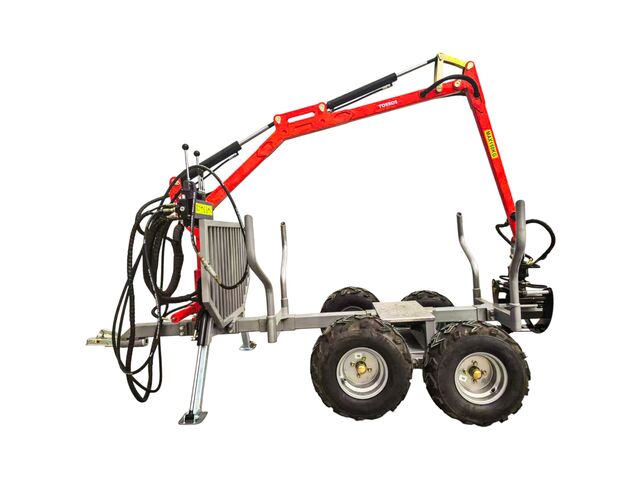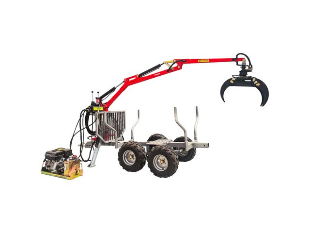 Remorque robuste pour le chargement et le transport de grumes et de bois. Livrée complète avec moteur d'entraînement et pompe, bras de grue hydraulique avec béquille et pieds de support.