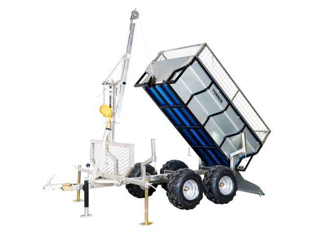 Fournie avec un kit de grue et un treuil manuel pour tirer et soulever de plus près les troncs d'arbres et les tailles, par exemple. La grue permet également de soulever et d'incliner la benne de chargement.
