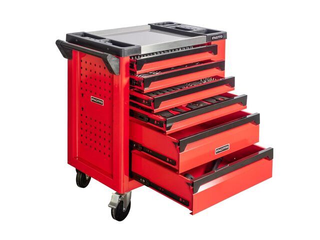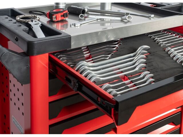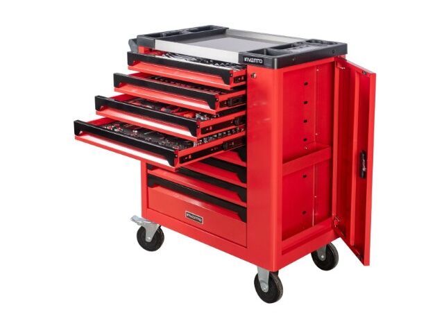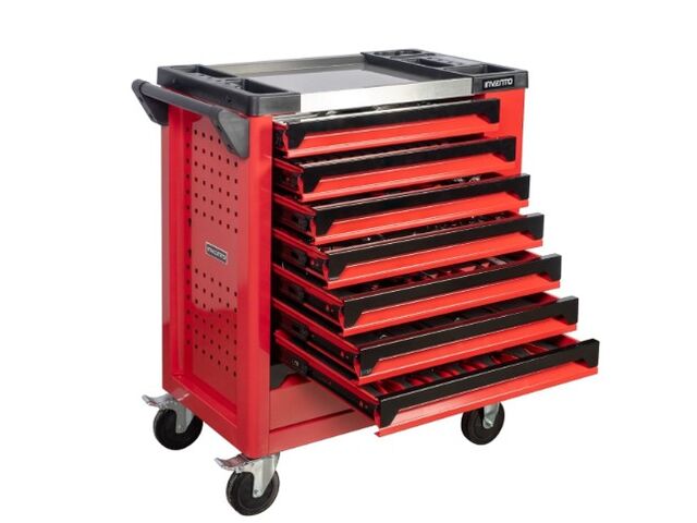 La servante d’atelier professionnelle INVENTO TRUCK est conçue pour les ateliers automobiles et les services de maintenance intervenant sur voitures particulières et poids lourds. Ce chariot d’outillage 220 pièces intègre huit tiroirs robustes permettant un rangement structuré et un accès rapide aux outils utilisés au quotidien. Le plateau supérieur en acier renforcé sert de surface de travail stable pour les opérations de réparation et d’entretien.