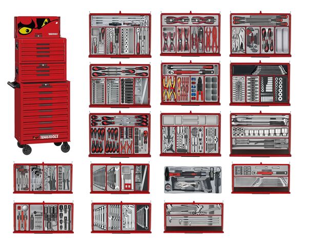Ce set Mega Master Tools se compose d'un ensemble d'outils organisés dans le système unique de Teng Tools, le tout rangé dans une tour constituée d'une servante et de 2 coffres.