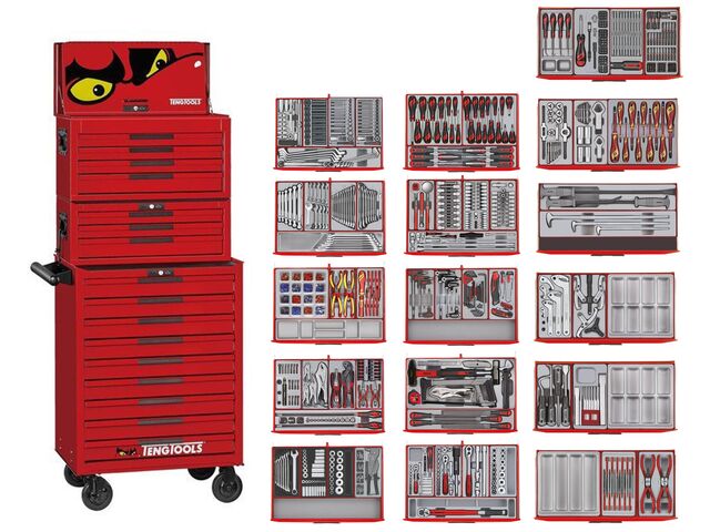 Ce set Mega Master Tools se compose d'un ensemble d'outils organisés dans le système unique de Teng Tools, le tout rangé dans une tour constituée d'une servante et de 2 coffres.
