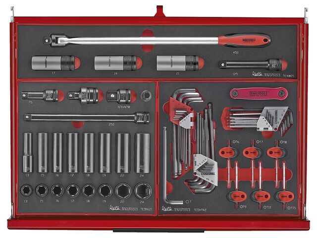 Ce set combine une servante d'atelier TCW807N et un coffre de rangement Teng Tools TC 806NF - avec le système de rangement en mousse. Les plateaux en mousse maintiennent les outils bien en place. Le contraste des couleurs noire et rouge permet de repérer immédiatement les outils manquants.